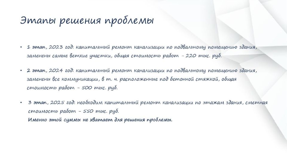 Механика акции: собрать 550 тыс. руб. на капитальный ремонт коммуникаций по этажам здания и начать работы по их замене с 02 июня 2025г. Сметная стоимость работ здесь.