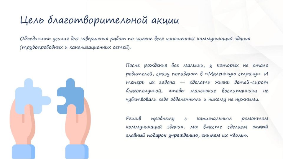 Давайте вместе решим сложную проблему износа коммуникаций и сделаем подарок КСУ СО ОО «Центра «Маленькая страна» от всех НАС.